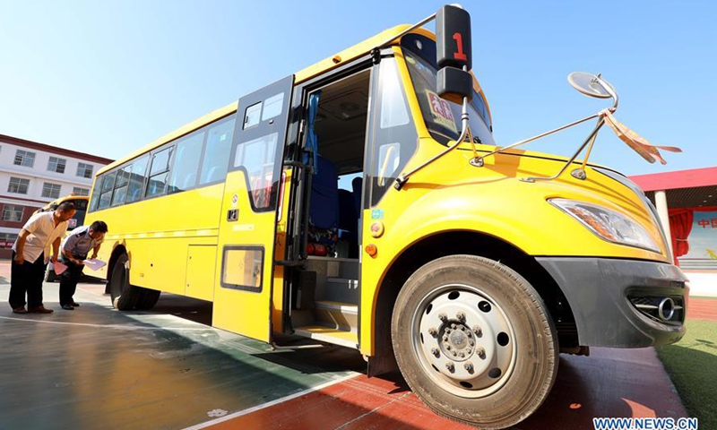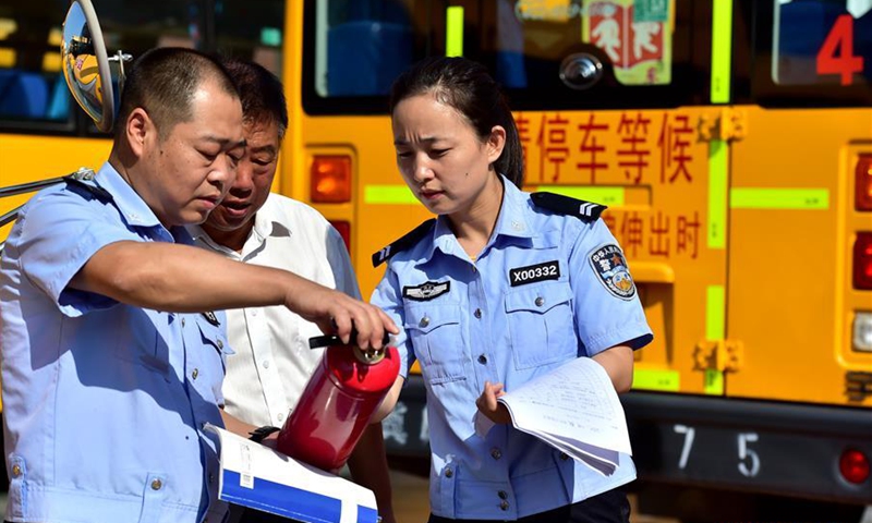 Police officers check a fire extinguisher fitted on a school bus of Tianhe primary school in Gaocheng District of Shijiazhuang, north China's Hebei Province, Aug. 27, 2020. Gaocheng District of Shijiazhuang organized police officers to carry out safety and performance checks of all school buses within the district, as a way to prepare for the new term and ensure the transportation safety of students. (Xinhua/Luo Xuefeng)
