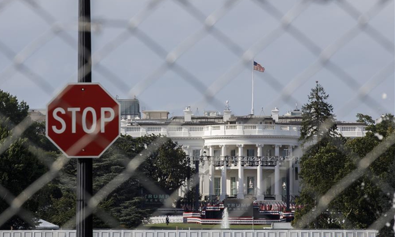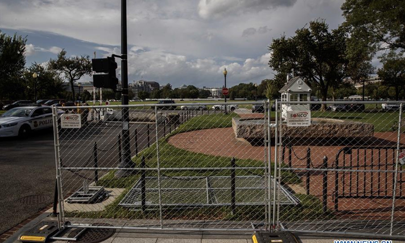 Security fences are set up outside the White House as U.S. President Donald Trump plans to deliver his Republican National Convention (RNC) acceptance speech at the White House, in Washington, D.C., the United States, on Aug. 27, 2020. The White House has beefed up security ahead of U.S. President Donald Trump's speech to accept the Republican Party's renomination from the South Lawn on Thursday night, while protesters are expected to stage demonstrations in the capital city. (Photo by Ting Shen/Xinhua)