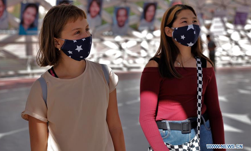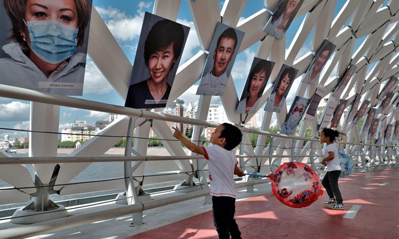 Children view photos at a photo exhibition in honor of medical workers in Nur-Sultan, Kazakhstan, Aug. 27, 2020. A photo exhibition in honor of medicals workers is held on a pedestrian bridge in Nur-Sultan, during which 100 portraits of medical workers are displayed. (Photo by Kalizhan Ospanov/Xinhua)