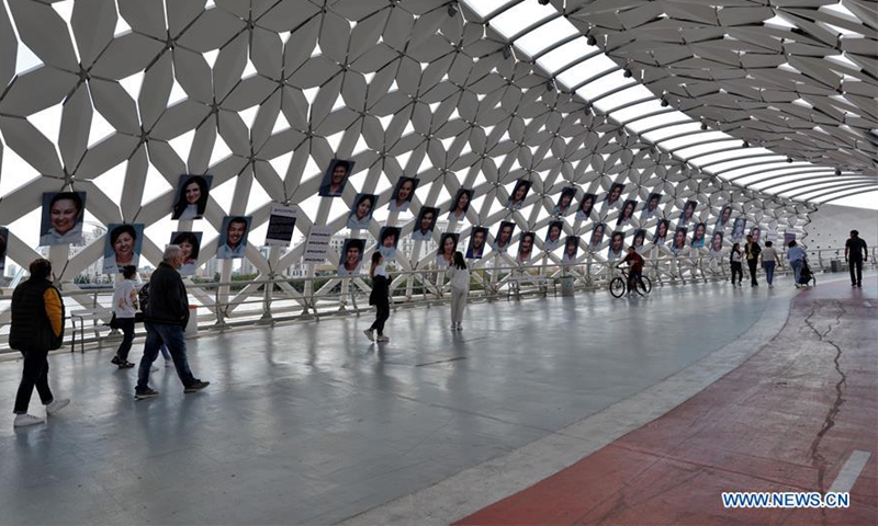 People visit a photo exhibition in honor of medical workers in Nur-Sultan, Kazakhstan, Aug. 27, 2020. A photo exhibition in honor of medicals workers is held on a pedestrian bridge in Nur-Sultan, during which 100 portraits of medical workers are displayed. (Photo by Kalizhan Ospanov/Xinhua)