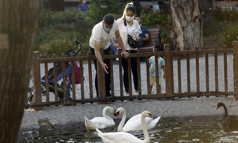 People wearing face masks feed swans in a park in Ankara, Turkey, on Aug. 28, 2020. Turkey confirmed 1,517 new COVID-19 cases on Friday, raising the total diagnosed patients to 265,515, Turkish Health Minister Fahrettin Koca said. (Photo by Mustafa Kaya/Xinhua)