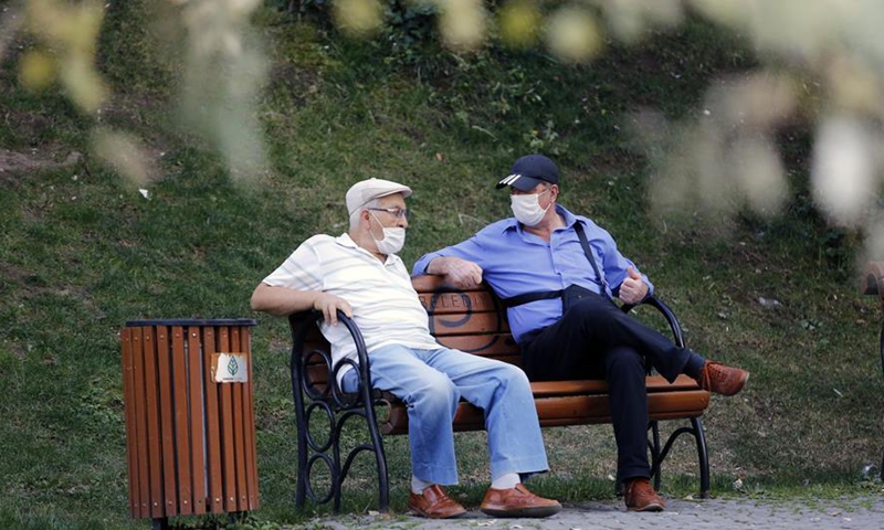 Two men wearing face masks sit on a bench in a park in Ankara, Turkey, on Aug. 28, 2020. Turkey confirmed 1,517 new COVID-19 cases on Friday, raising the total diagnosed patients to 265,515, Turkish Health Minister Fahrettin Koca said. (Photo by Mustafa Kaya/Xinhua)