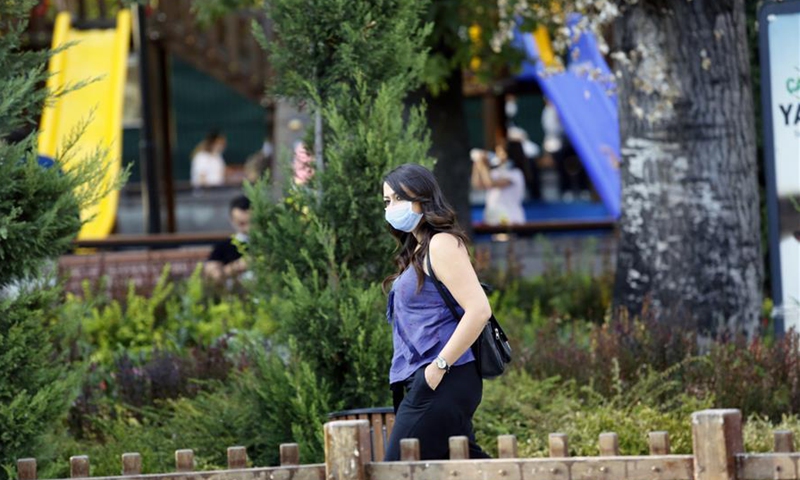 A woman wearing a face mask walks in a park in Ankara, Turkey, on Aug. 28, 2020. Turkey confirmed 1,517 new COVID-19 cases on Friday, raising the total diagnosed patients to 265,515, Turkish Health Minister Fahrettin Koca said. (Photo by Mustafa Kaya/Xinhua)