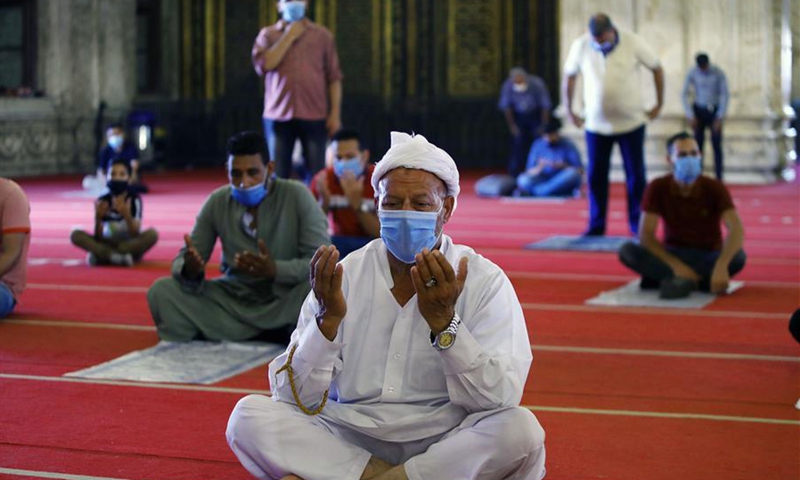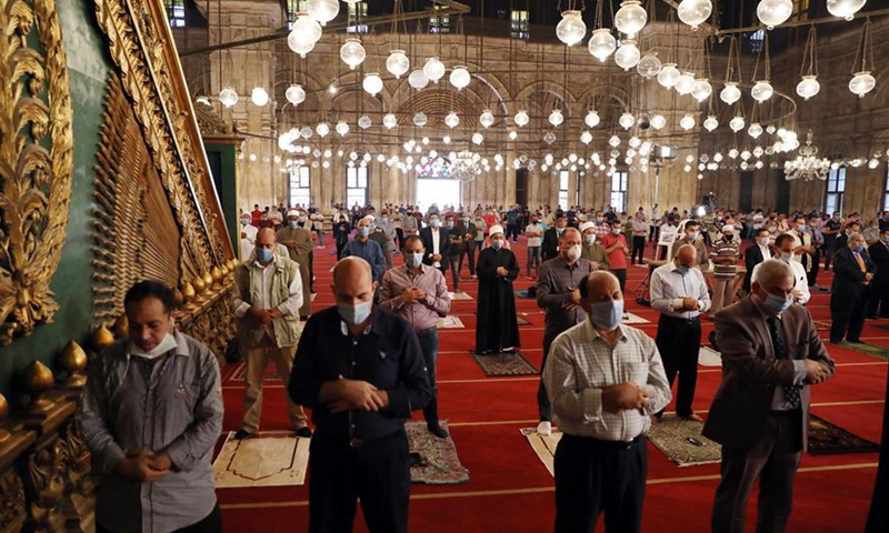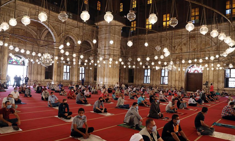 People wearing face masks attend the Friday prayers at Mohamed Ali Mosque in Cairo, Egypt, on Aug. 28, 2020. Egypt registered on Friday 223 new COVID-19 infections, raising the total cases in the country to 98,285, Egyptian Health Ministry said in a statement. (Xinhua/Ahmed Gomaa)