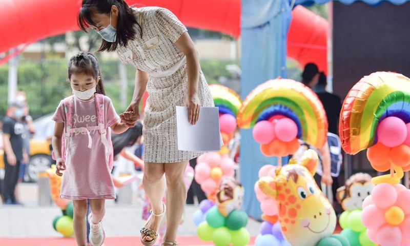 A teacher leads a first grader into the campus at Dongshengshiyan Primary School in Haidian District, Beijing, capital of China, Aug. 29, 2020. Students of senior high schools, first and third grades of junior high schools, and first grade of primary schools returned to school in Beijing on Saturday.Photo:Xinhua