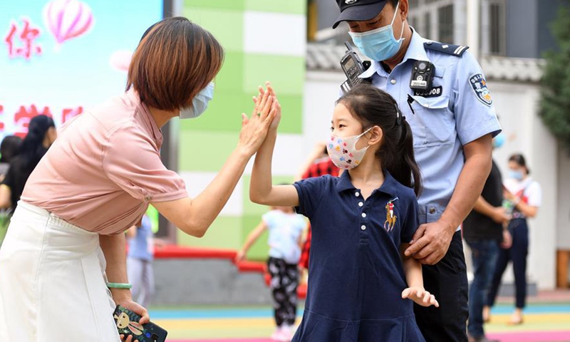 A teacher(L) greets a first grader at Taipinglu Primary School in Haidian District, Beijing, capital of China, Aug. 29, 2020. Students of senior high schools, first and third grades of junior high schools, and first grade of primary schools returned to school in Beijing on Saturday.Photo:Xinhua