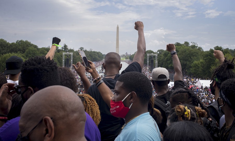 Demonstrators gather at the Lincoln Memorial for the "Commitment March: Get Your Knee Off Our Necks" event in Washington, D.C., the United States, Aug. 28, 2020. (Photo by Alan Chin/Xinhua)