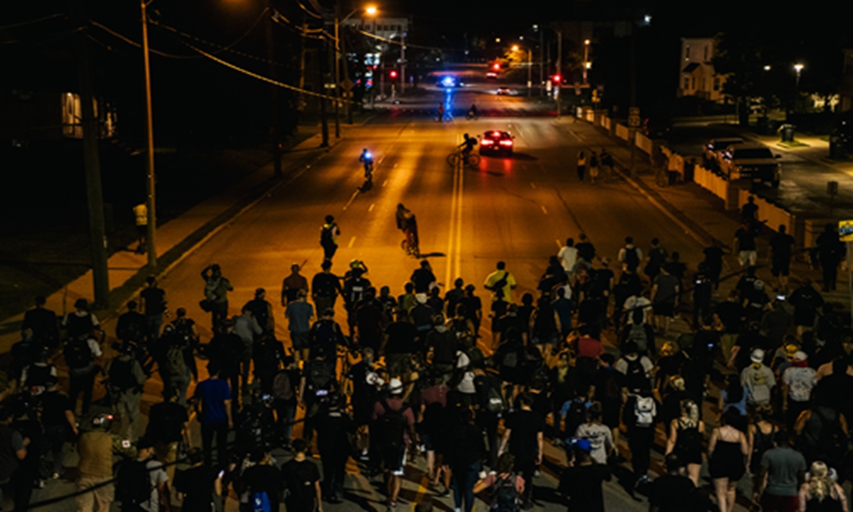 Demonstrators march on Wednesday in Kenosha, Wisconsin. The city declared a state of emergency curfew after a fourth night of civil unrest after the shooting of Jacob Blake on Sunday. Photo: AFP