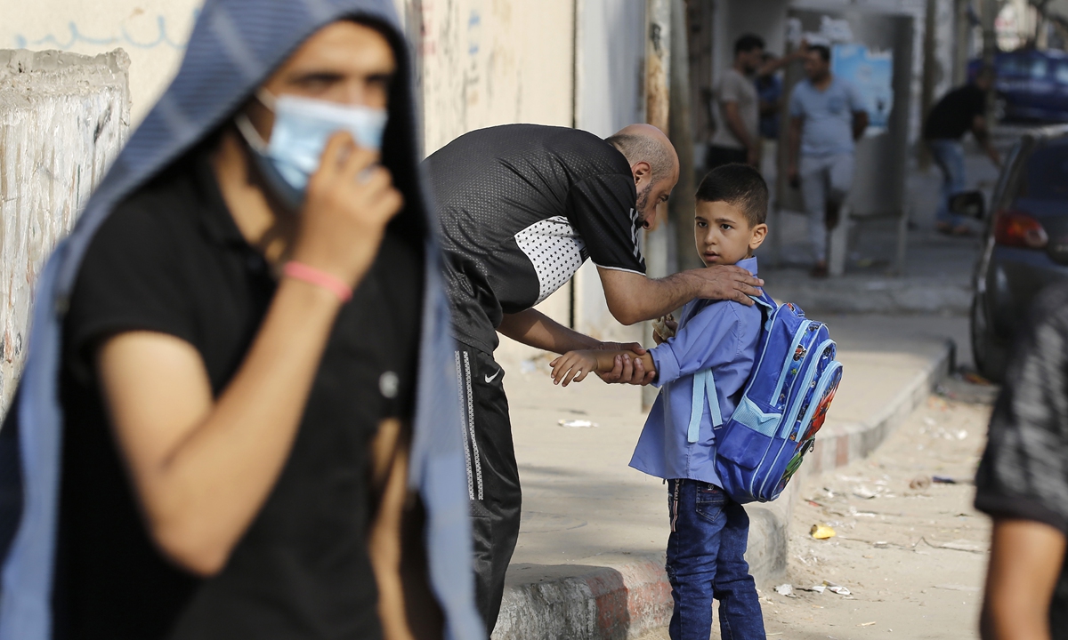 A Palestinian father picks up his son from a school run by the United Nations Relief and Works Agency in Gaza City on Thursday. Israel attacked Hamas targets in Gaza and halted its fuel flow into the enclave, in the latest measures over a wave of airborne fire bombs from the Palestinian territory. Photo: AFP