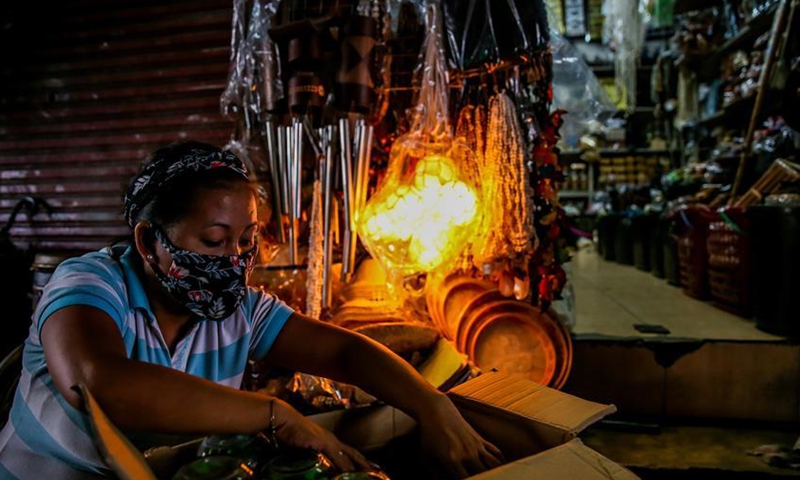 A woman arranges handicraft articles inside a shop in Manila, the Philippines, Aug. 29, 2020. (Xinhua/Rouelle Umali)