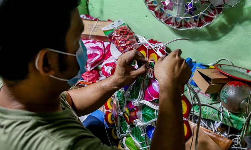 A man works on a lantern at a shop in Manila, the Philippines, Aug. 29, 2020. (Xinhua/Rouelle Umali)