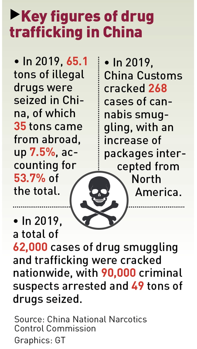 An increasing number of cases of cannabis seized in China involve packages from North America, including Canada, which legalized cannabis in October 2018, as well as some states in the US where drug-taking is legal, Hua Zhendong, technical director of the national narcotics laboratory under the National Narcotics Control Commission, told the Global Times.