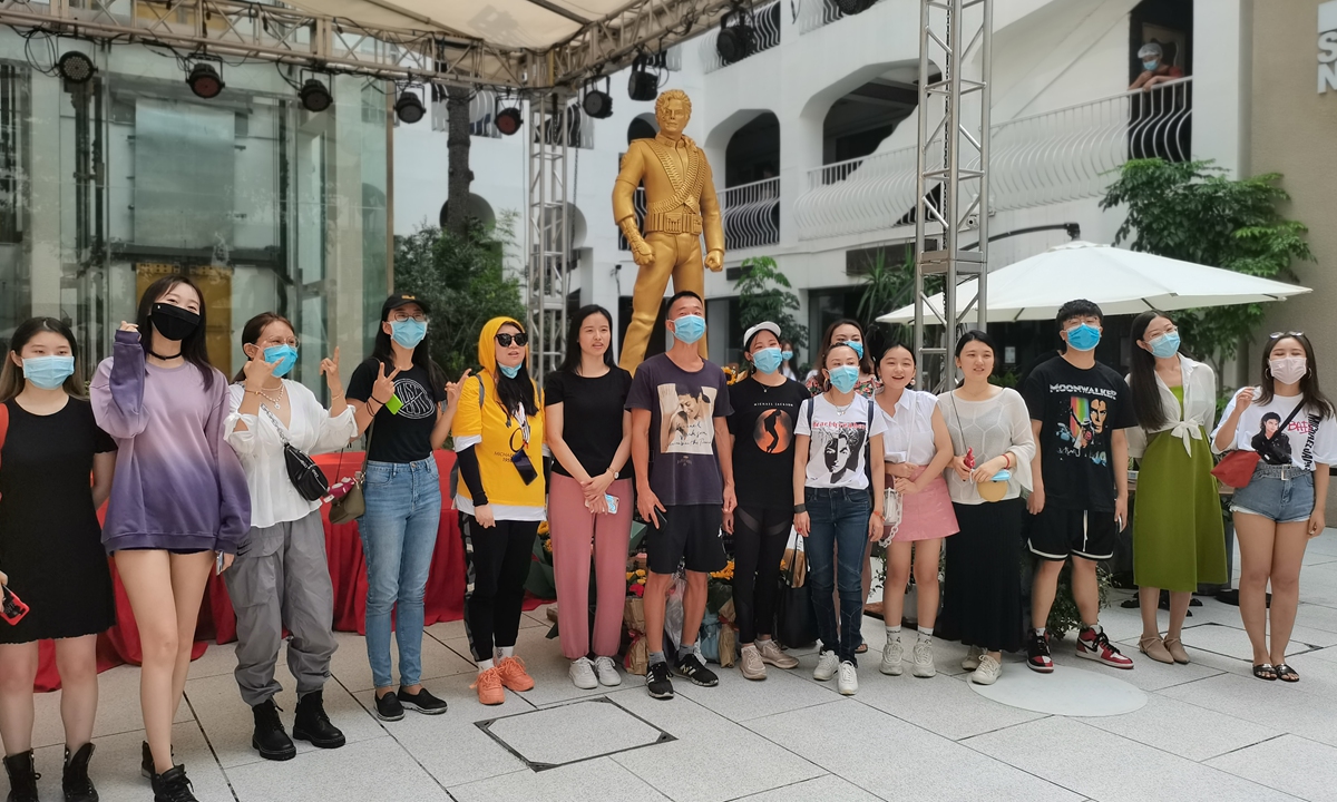 Chinese fans of Michael Jackson pose for a group photo with the statue. Photo: Li Yuche/GT