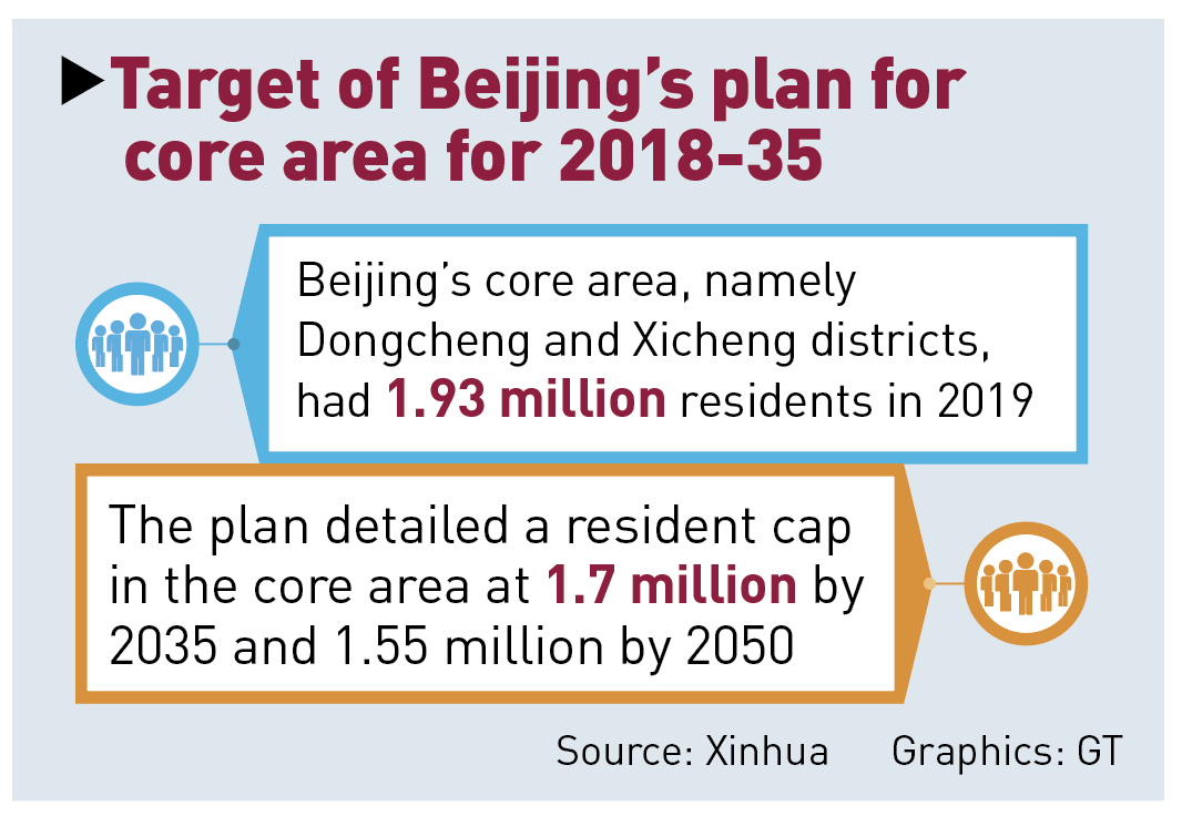 The core area, namely Dongcheng and Xicheng districts, covers 92.5 square kilometers with 1.93 million residents as of 2019. It is endowed with the functions of China's political, cultural and international exchange centers, according to the plan.