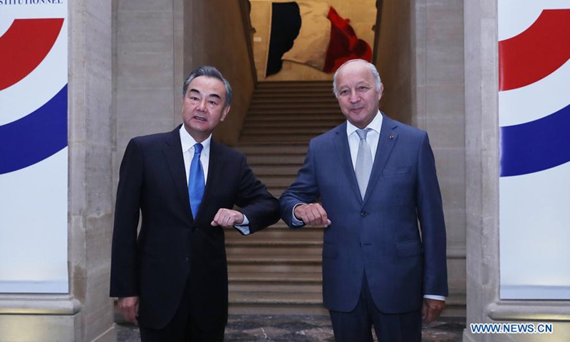Chinese State Councilor and Foreign Minister Wang Yi (L) touches elbows with Laurent Fabius, president of France's Constitutional Council, in Paris, France, on Aug. 29, 2020. (Xinhua/Gao Jing)