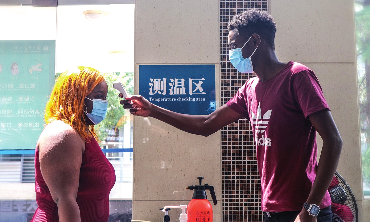 Barry (right), a college student at Central China Normal University from Gambia, checks a female student's body temperature on August 28, serving as an anti-epidemic volunteer. Photo: Courtesy of CCNU
