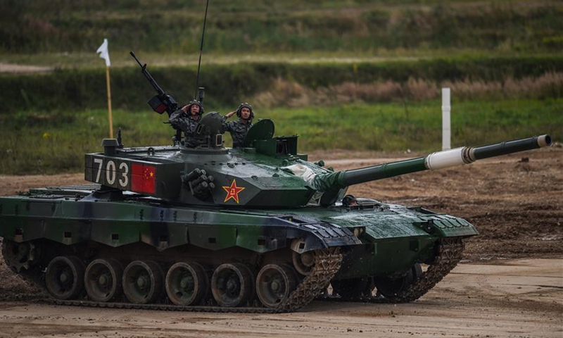 Chinese team takes part in the tank biathlon's singles during the International Army Games 2020 in a suburb of Moscow, Russia, Aug. 30, 2020. (Xinhua/Tian Dingyu)