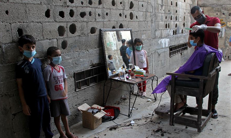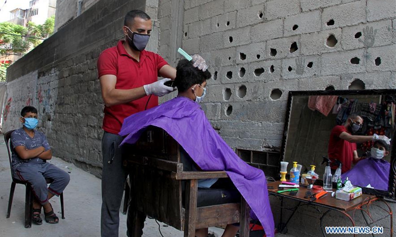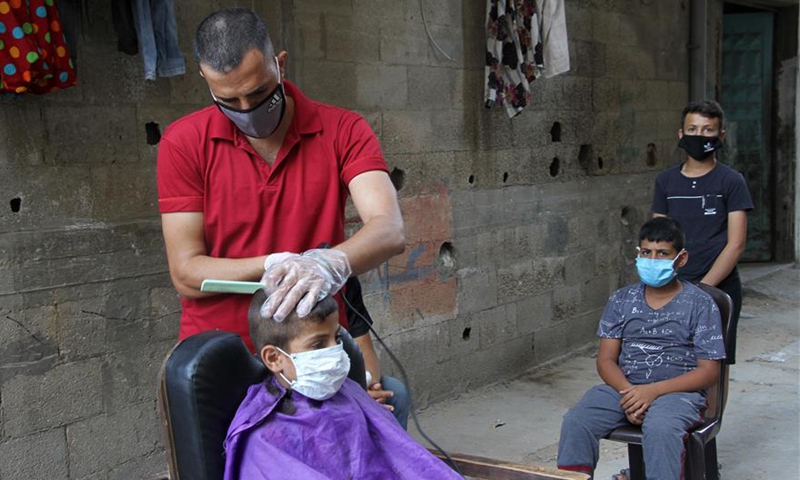 A Palestinian barber wearing a mask and gloves shaves for a boy free of charge during the lockdown to curb the spread of COVID-19, in Gaza City, on Aug. 31, 2020. Palestine recorded the highest daily rise of COVID-19 cases on Monday after the outbreak of the deadly pandemic in the Palestinian territories in March. The health ministry recorded in the last 24 hours seven deaths and 875 new COVID-19 cases in the West Bank, East Jerusalem, and the Gaza Strip. (Photo by Rizek Abdeljawad/Xinhua)