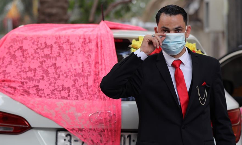 A Palestinian groom wearing a face mask is seen at his wedding ceremony in the southern Gaza Strip city of Khan Younis, on Aug. 31, 2020. Palestine recorded the highest daily rise of COVID-19 cases on Monday after the outbreak of the deadly pandemic in the Palestinian territories in March. The health ministry recorded in the last 24 hours seven deaths and 875 new COVID-19 cases in the West Bank, East Jerusalem, and the Gaza Strip. (Photo by Yasser Qudih/Xinhua)