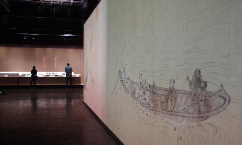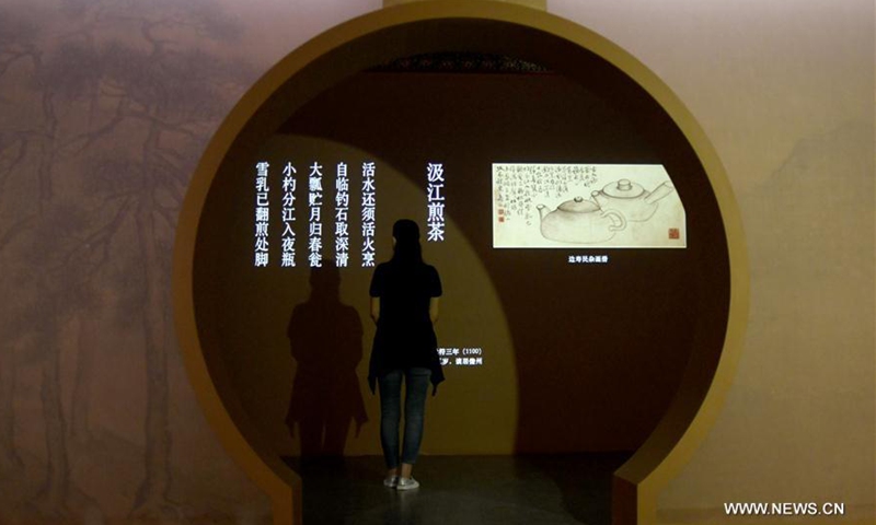 A guest looks at exhibits as she attends the press conference of an exhibition on the calligraphy and painting of Su Shi at the Palace Museum in Beijng, capital of China, Aug. 31, 2020. An exhibition on the calligraphy and painting of Su Shi (also known as Su Dongpo), a famous litterateur of the Northern Song Dynasty (960-1127), will be held here from Sept. 1 to Oct. 30. (Xinhua/Jin Liangkuai)