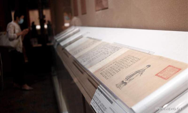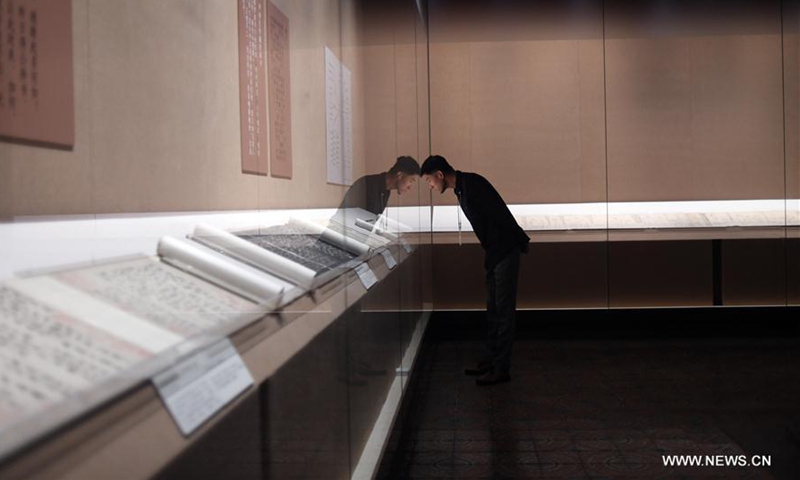 A guest looks at exhibits as he attends the press conference of an exhibition on the calligraphy and painting of Su Shi at the Palace Museum in Beijng, capital of China, Aug. 31, 2020. An exhibition on the calligraphy and painting of Su Shi (also known as Su Dongpo), a famous litterateur of the Northern Song Dynasty (960-1127), will be held here from Sept. 1 to Oct. 30. (Xinhua/Jin Liangkuai)
