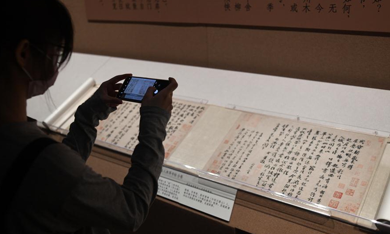 A guest takes photos of exhibits as she attends the press conference of an exhibition on the calligraphy and painting of Su Shi at the Palace Museum in Beijng, capital of China, Aug. 31, 2020. An exhibition on the calligraphy and painting of Su Shi (also known as Su Dongpo), a famous litterateur of the Northern Song Dynasty (960-1127), will be held here from Sept. 1 to Oct. 30. (Xinhua/Jin Liangkuai)