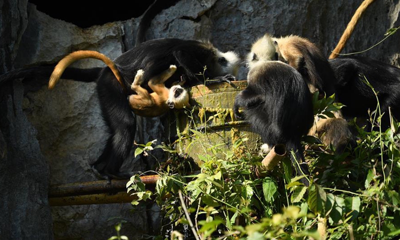 White-headed langurs drink water in the Banli subarea of the Guangxi Chongzuo national nature reserve in Chongzuo City, south China's Guangxi Zhuang Autonomous Region, Dec. 3, 2019. (Photo by Wu Shujun/Xinhua)