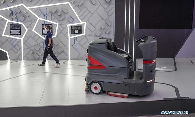Photo taken on Sept. 1, 2020 shows a cleaning robot working in an outdoor exhibition pavilion near the China National Convention Center, where the China International Fair for Trade in Services (CIFTIS) will be held, in the Beijing Olympic Park in Beijing, capital of China. The CIFTIS, a major platform for the services trade in the country, will be held in early September in Beijing. (Xinhua/Peng Ziyang)