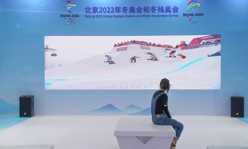 A woman watches a promotional video of winter games in an outdoor exhibition pavilion near the China National Convention Center, where the China International Fair for Trade in Services (CIFTIS) will be held, in the Beijing Olympic Park in Beijing, capital of China, Sept. 1, 2020. The CIFTIS, a major platform for the services trade in the country, will be held in early September in Beijing. (Xinhua/Peng Ziyang)