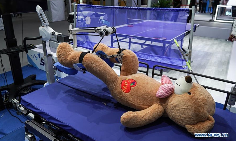 Photo taken on Sept. 1, 2020 shows a rehabilitation robot functioning in an outdoor exhibition pavilion near the China National Convention Center, where the China International Fair for Trade in Services (CIFTIS) will be held, in the Beijing Olympic Park in Beijing, capital of China. The CIFTIS, a major platform for the services trade in the country, will be held in early September in Beijing. (Xinhua/Peng Ziyang)