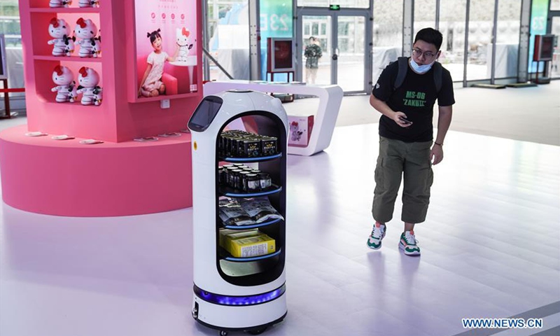 Photo taken on Sept. 1, 2020 shows a food delivery robot working in an outdoor exhibition pavilion near the China National Convention Center, where the China International Fair for Trade in Services (CIFTIS) will be held, in the Beijing Olympic Park in Beijing, capital of China. The CIFTIS, a major platform for the services trade in the country, will be held in early September in Beijing. (Xinhua/Peng Ziyang)
