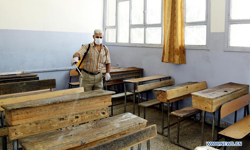 A member of staff disinfects a classroom at a school in Damascus, capital of Syria, on Sept. 1, 2020. (Photo by Ammar Safarjalani/Xinhua)