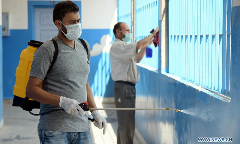 Members of staff disinfect a school in Damascus, capital of Syria, on Sept. 1, 2020. (Photo by Ammar Safarjalani/Xinhua)