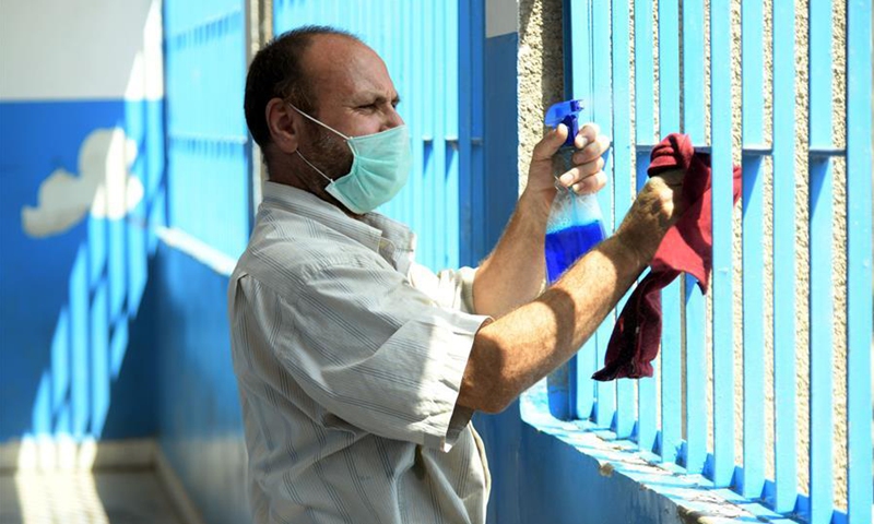 A member of staff disinfects windows at a school in Damascus, capital of Syria, on Sept. 1, 2020. (Photo by Ammar Safarjalani/Xinhua)