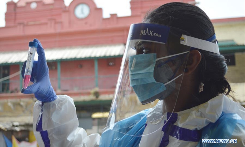 An Indian health worker takes swab tests of the shop owners and workers at KR Market, which reopens after five months of closure due to COVID-19 pandemic, in Bangalore, India, Sept. 1, 2020. (Str/Xinhua)