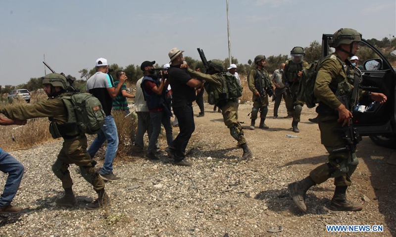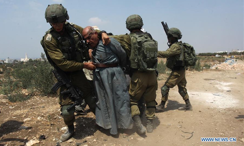 Israeli soldiers detain a Palestinian protester during a protest against the expansion of Jewish settlements and the Israeli annexation plan, in the village of Shofa near the West Bank city of Tulkarem, on Sept. 1, 2020. (Photo by Nidal Eshtayeh/Xinhua)