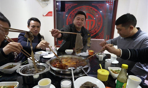 Diners eat hotpot at a restaurant in Chengdu, Sichuan province. [Photo/Xinhua]