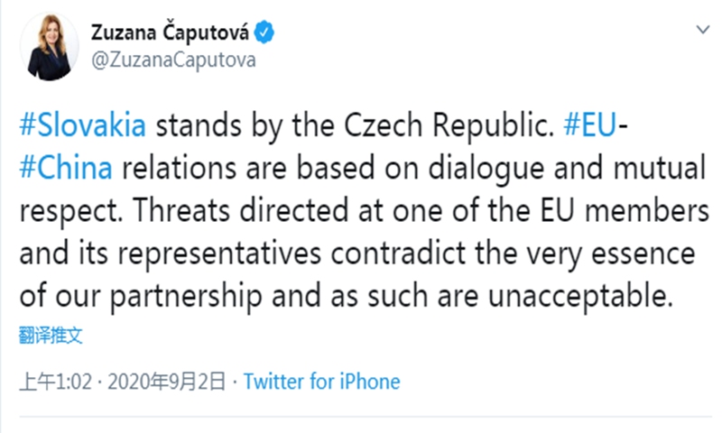 After Wang reiterated China's stance on the Taiwan question, Caputova tweeted that Slovakia stands by the Czech Republic, calling China's firm response to Vystrcil's visit "unacceptable." She called on "dialogue and mutual respect" between China and the EU, but failed to mention who first provoked the situation.