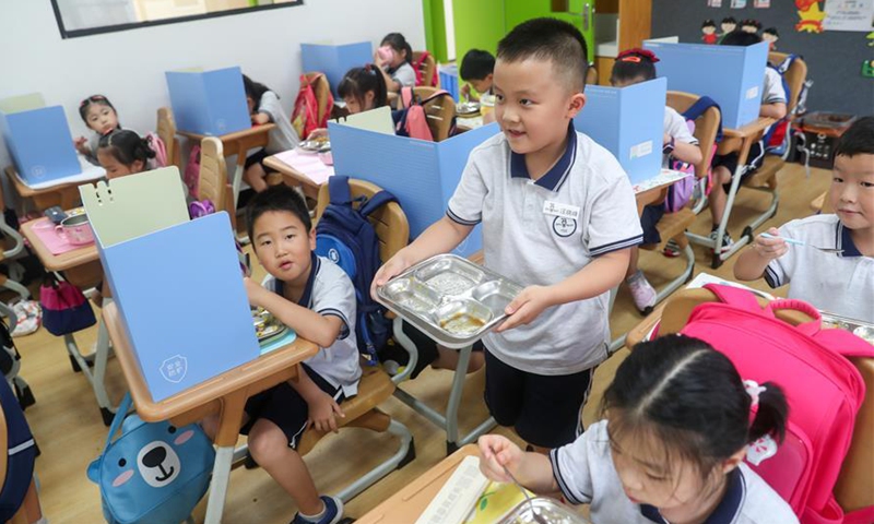 Students return plates after lunch at a primary school in Changning District of Shanghai, east China, Sept. 2, 2020. The school promotes the "Clear Your Plate" campaign to stem food waste as new semester begins. (Xinhua/Ding Ting)