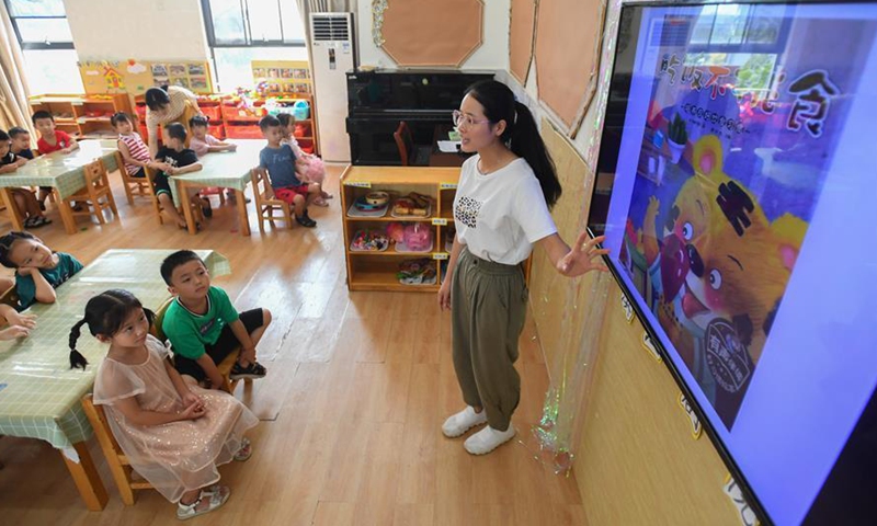 A teacher tells stories before having meals at a kindergarten in Changsha, central China's Hunan Province, Sept. 2, 2020. The kindergarten has cultivated children's awareness of treasuring food from a very young age and helped them form good eating habits. (Xinhua/Chen Zeguo)