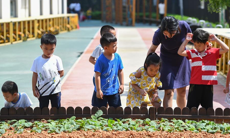 A teacher helps students make out crops at a kindergarten in Changsha, central China's Hunan Province, Sept. 2, 2020. The kindergarten has cultivated children's awareness of treasuring food from a very young age and helped them form good eating habits. (Xinhua/Chen Zeguo)