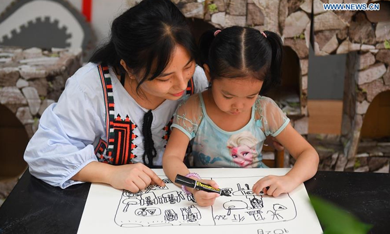 A teacher instructs a student to draw a picture about treasuring food at a kindergarten in Changsha, central China's Hunan Province, Sept. 2, 2020. The kindergarten has cultivated children's awareness of treasuring food from a very young age and helped them form good eating habits. (Xinhua/Chen Zeguo)