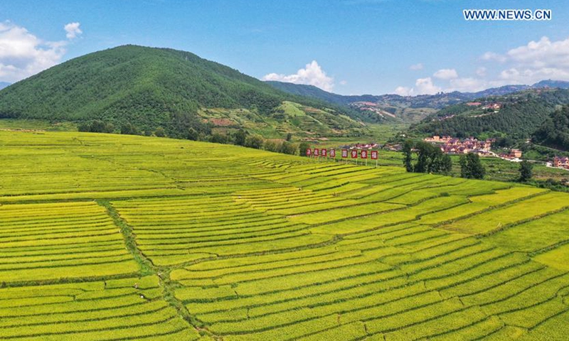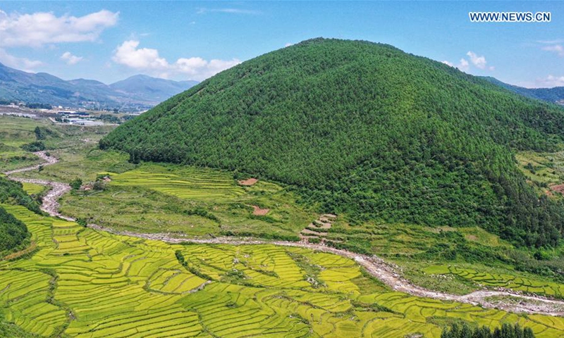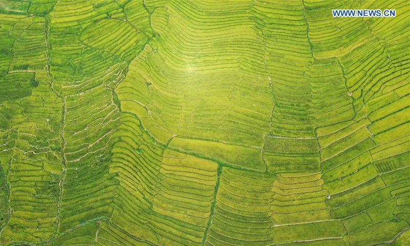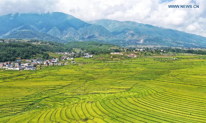 Aerial photo taken on Sept. 2, 2020 shows terraced fields in Huangcaoping Village of Luojishan Township, Puge County, Liangshan Yi Autonomous Prefecture, southwest China's Sichuan Province. (Xinhua/Wang Xi)