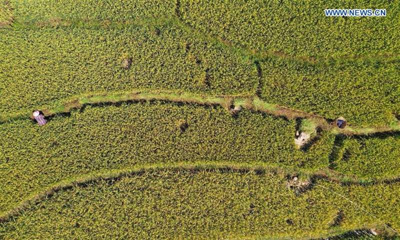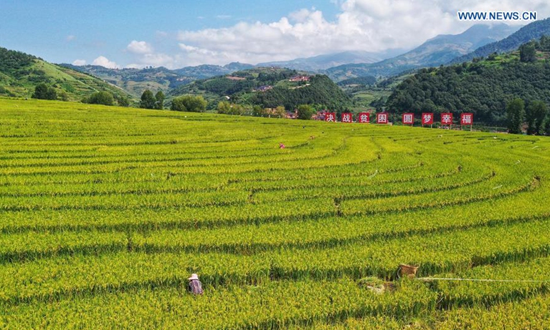 Aerial photo taken on Sept. 2, 2020 shows farmers working in the terraced fields in Huangcaoping Village of Luojishan Township, Puge County, Liangshan Yi Autonomous Prefecture, southwest China's Sichuan Province. (Xinhua/Wang Xi)
