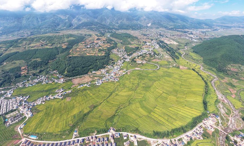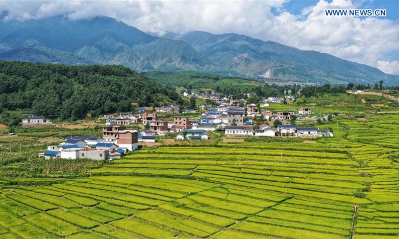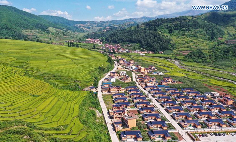 Aerial photo taken on Sept. 2, 2020 shows a newly-built residential area next to terraced fields in Huangcaoping Village of Luojishan Township, Puge County, Liangshan Yi Autonomous Prefecture, southwest China's Sichuan Province. (Xinhua/Wang Xi)