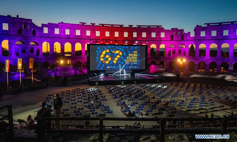 The ancient amphitheatre is lit in colors during the 67th Pula Film Festival in Pula, Croatia, Sept. 1, 2020. Pula Film Festival was established in 1954. This year's festival is held from Aug. 29 to Sept. 4 with epidemiological measures against COVID-19. (Srecko Niketic/Pixsell via Xinhua)