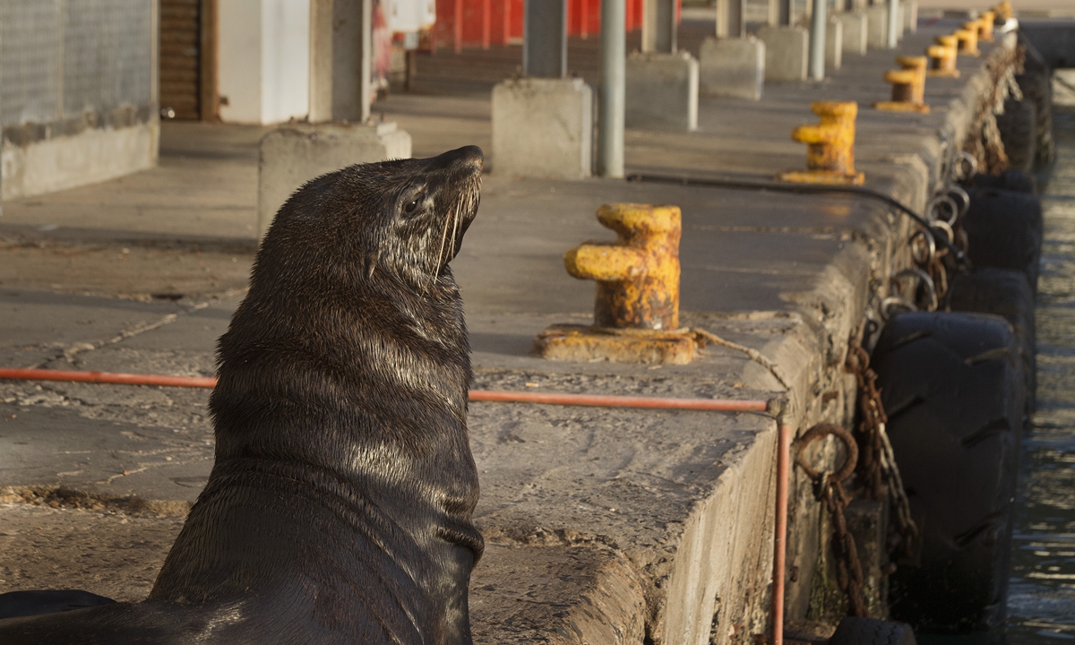 A Cape Fur Seal sunbathes on the deserted quay at Kalk Bay Harbour, where it would usually get scraps of fish from fishermen and tourists, in Kalk Bay on April 14 in Cape Town. Photo: AFP