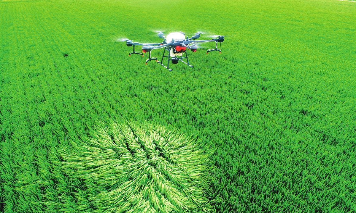 A drone is used to spray pesticide in a rice paddy in Taizhou, East China's Jiangsu Province on Thursday. Local autumn grain production is going through a crucial period in preventing insect infestations, with drones employed to protect crops. Photo: cnsphoto