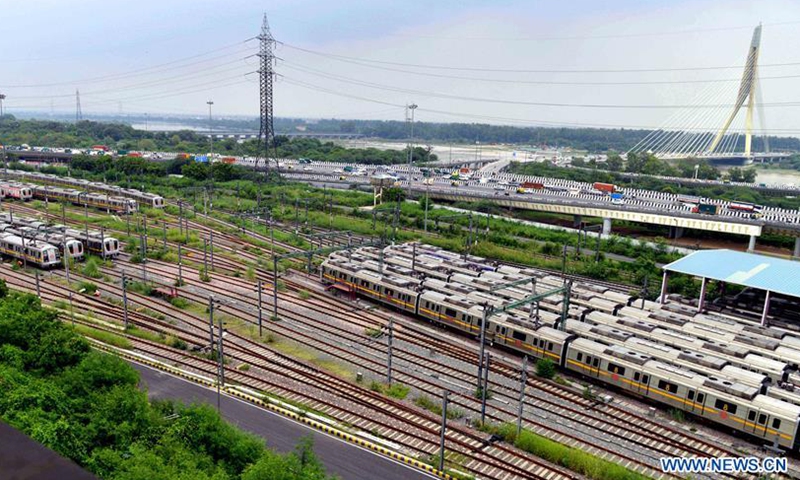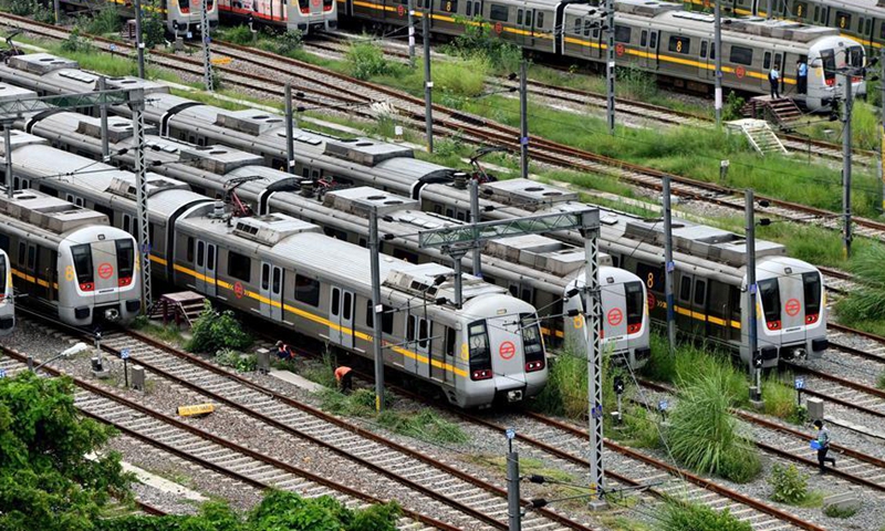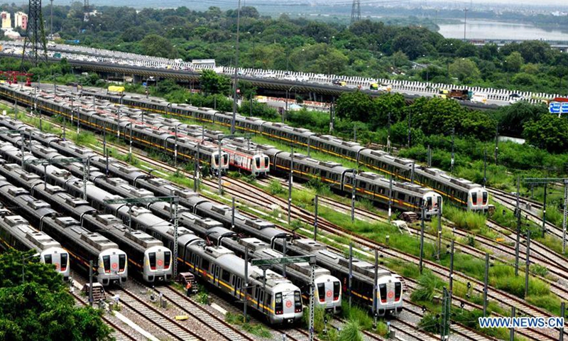 Metro trains are parked at a yard in New Delhi, India, on Sept. 2, 2020. India entered the Unlock 4 with effect from Tuesday. Fresh guidelines to be followed during Unlock 4 were issued last Saturday. Metro Rail services would be allowed to start from Sept. 7 in a graded manner, and public functions, or other congregations, would be allowed with a ceiling of 100 persons from Sept. 21. (Photo by Partha Sarkar/Xinhua)