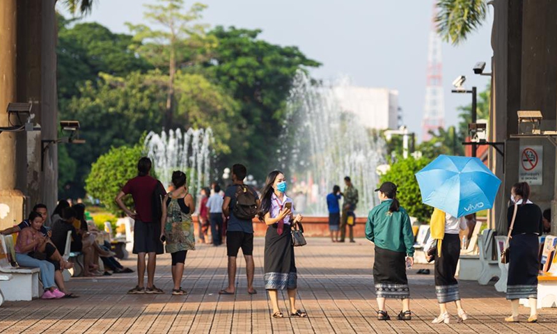 Tourists take photos for local Lao youngsters in front of the Prime Minister's Office in Vientiane, Laos, on Sept. 2, 2020. As the coutry's COVID-19 pandemic situation is eased, the daily life in Lao capital Vientiane is returning to normal. (Photo by Kaikeo Saiyasane/Xinhua)